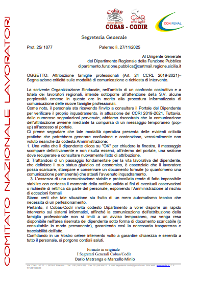 Pertanto, il Cobas-Codir invita codesto Dipartimento a voler disporre un rapido intervento sui sistemi informatici, affinché la comunicazione dell’attribuzione della famiglia professionale non si limiti a un avviso temporaneo, ma venga resa disponibile nell’area riservata del dipendente sotto forma di documento scaricabile (o consultabile in modo permanente), garantendo così la necessaria trasparenza e tracciabilità dell’atto.
