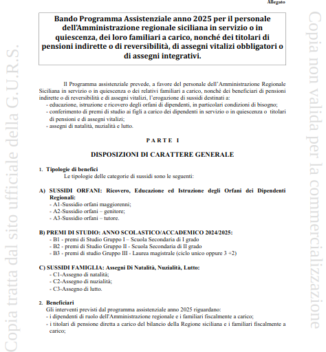 È stato pubblicato nella Gurs n. 55 del 24 dicembre 2025 il programma Assistenziale anno 2025 a favore del personale dell’Amministrazione regionale in servizio o in quiescenza, dei relativi familiari a carico, nonché dei titolari di pensioni indirette o di reversibilità o di assegni vitalizi obbligatori o di assegno integrativo, approvato con Decreto Assessoriale n. 34 del 16 dicembre 2025.