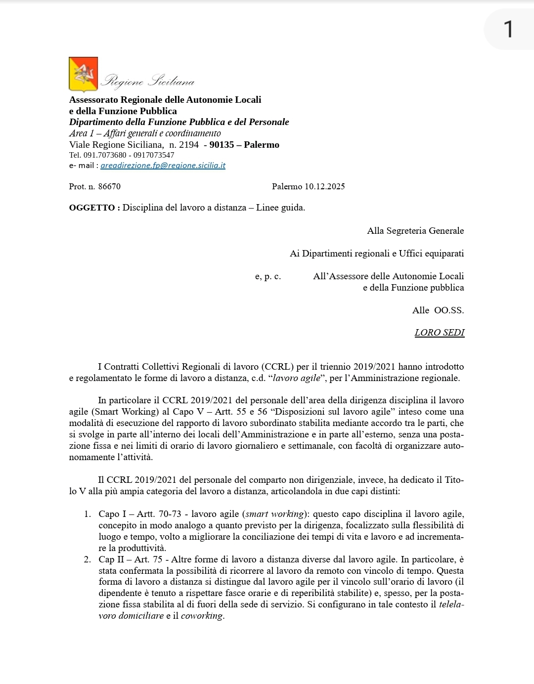 Circolare prot. n. 8670 del 10/12/2025. Disciplina del lavoro a distanza – Linee guida