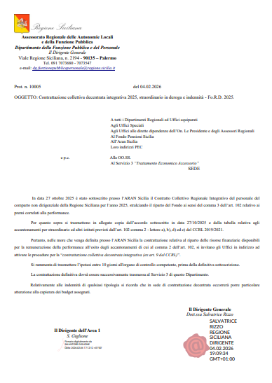 Con nota prot. n. 10005 del 4 febbraio 2026, il Dipartimento Regionale della Funzione Pubblica e del Personale ha fornito indicazioni operative a tutti i Dipartimenti regionali, agli Uffici equiparati, agli Uffici speciali, agli Uffici alle dirette dipendenze dell’On.le Presidente e degli Assessori regionali, al Fondo Pensioni Sicilia e all’ARAN Sicilia in merito alla Contrattazione Collettiva Decentrata Integrativa (CCDI) 2025, allo straordinario in deroga e alle indennità a valere sul Fo.R.D. 2025.